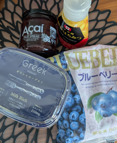 ギリシャヨーグルト、アサイー、ハチミツ、冷凍ブルーベリー、バナナ。